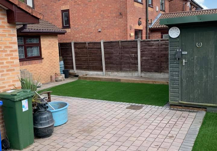 This customer in Dukinfield wanted a flagged base for a greenhouse they had purchased as well as the installation of some high quality 40mm Artificial Grass to two areas in their back garden.